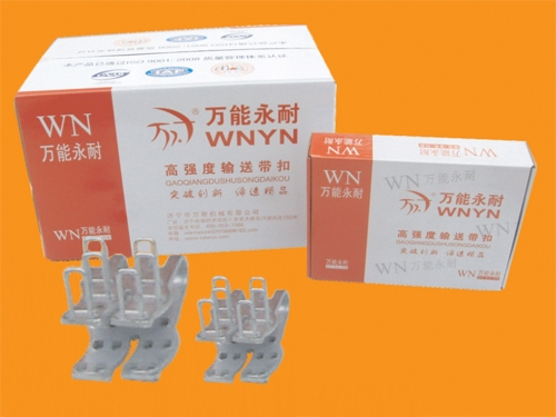 WN-1A-6针高强 力皮带扣采用钢材,钉子采用三钉平等布局,有效化解输送带和皮带扣之间的拉力。该产品设计合理,外形美观,适用于高强 力输送带,其优点是连接强度大,耐拉强度高。